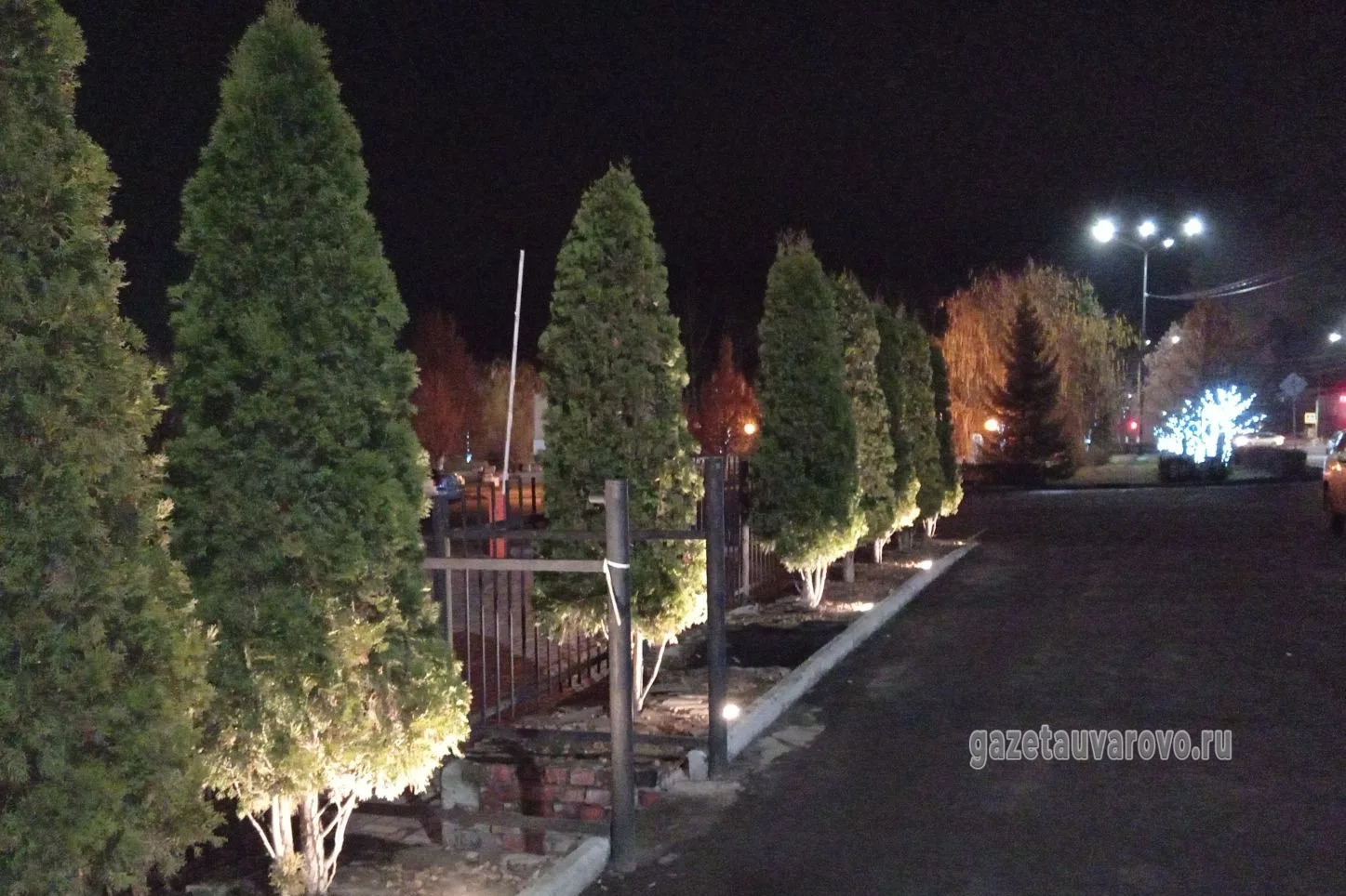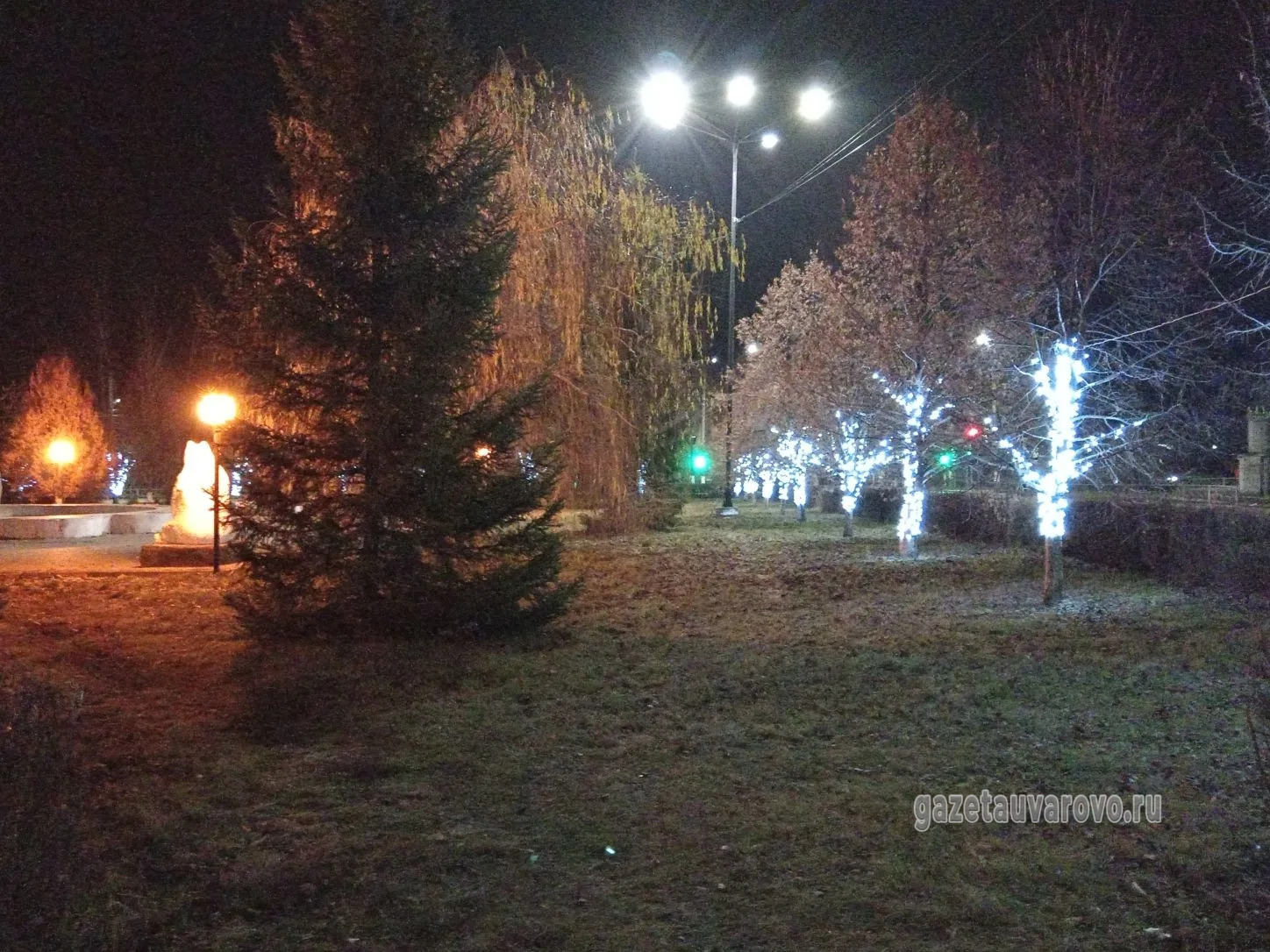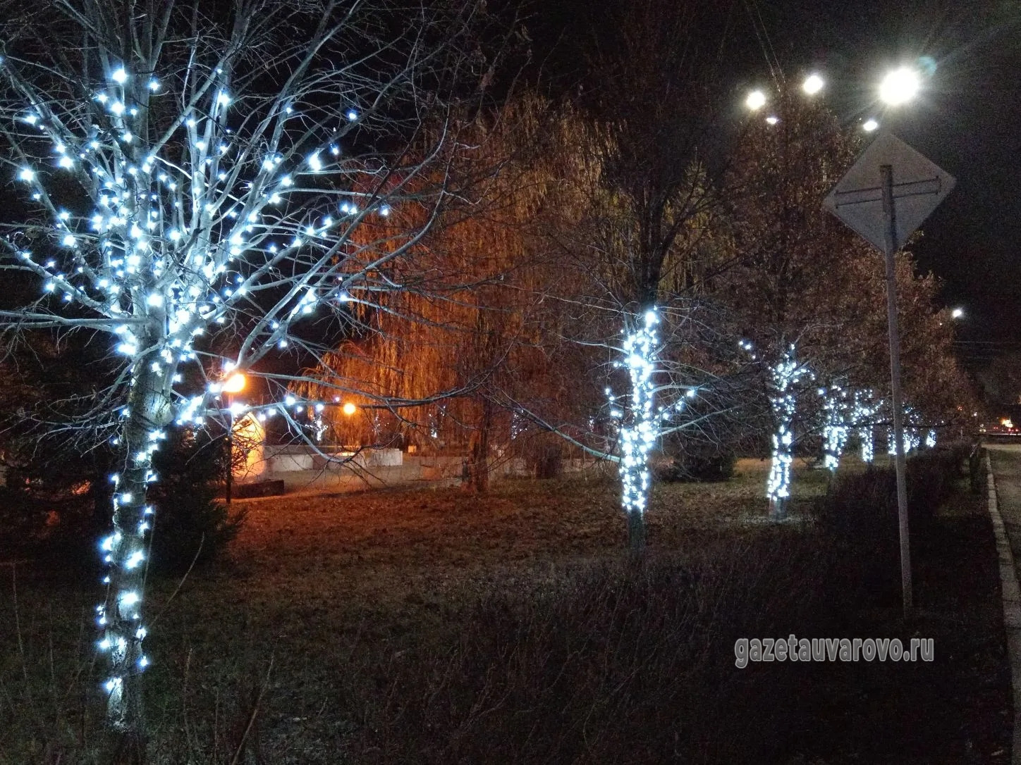 Переливаются разноцветными новогодними огоньками арки в Сквере влюблённых. На деревьях зажглись светящиеся шары.