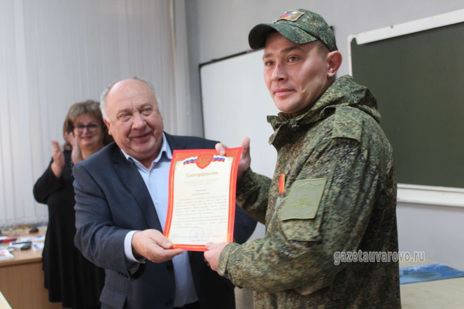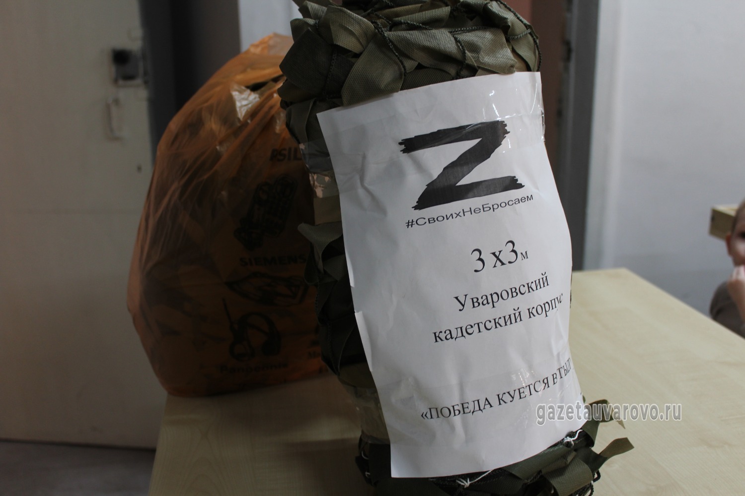 От администрации и воспитанников учебного заведения Виктору Викторову вручили благодарность за вклад в патриотическое и духовно-нравственное воспитание подрастающего поколения. Также кадеты преподнесли бойцу собственноручно изготовленные маскировочную сеть и костюм «Леший».