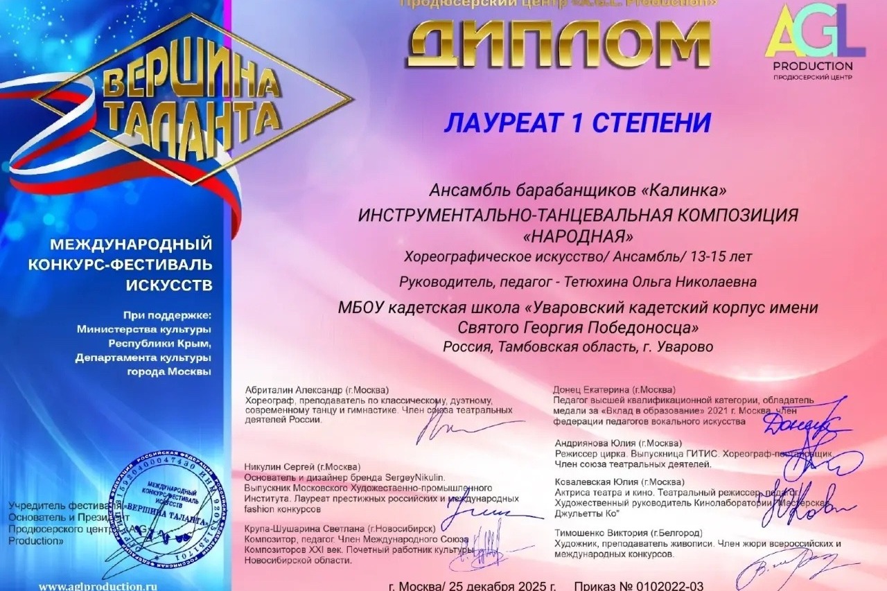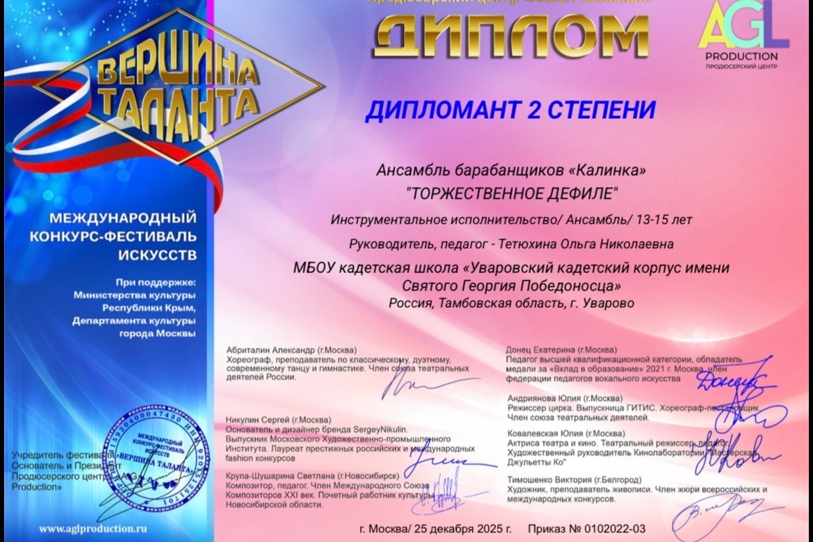 Уваровский кадетский корпус им. Святого Георгия Победоносца для участия в Международном конкурсе-фестивале «Вершина таланта» отправил видеозаявку ансамбля барабанщиков «Калинка». Под руководством педагога Ольги Тетюхиной ансамбль стал участником в двух номинациях — «Хореографическое искусство» и «Инструментальное исполнительство».
